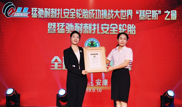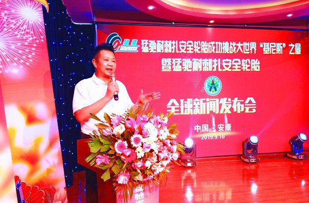 本网讯(高文玉 紫默)2019年9月10日上午10时,在中国版图核心地的陕西安康隆重举行“猛驰耐刺扎轮胎”成功挑战大世界基尼斯之最颁证庆典暨猛驰耐刺扎安全轮胎全球新闻发布会。扎7700颗钉子,不需补胎换胎,还能在高速公路上安全行驶200公里以上。8月28日,由安康高新技术产业开发区管委会主办,陕西猛驰汽车科技有限公司承办,安康高新区经济发展科技局、安康高新区招商局、安康周发猛艺术学校协办的猛驰耐刺扎轮胎挑战“大世界基尼斯之最”在安康高新区挑战成功。