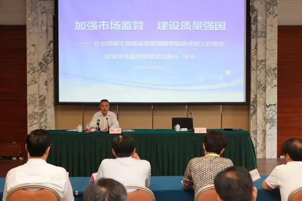 在我国第40个全国“质量月”到来之际,9月1日,由中共中央组织部、中国浦东干部学院和国家市场监督管理总局共同举办的“省部级干部建设质量强国专题研讨班”在沪开班,这也是继两年前在京举办首个省部级干部“全面实施质量强国战略专题研讨班”之后的第二个省部级质量强国战略专题研讨班。市场监管总局局长、党组副书记张茅作为首位授课人,在专题研讨班上以“加强市场监管 建设质量强国”为题做了专题讲座。