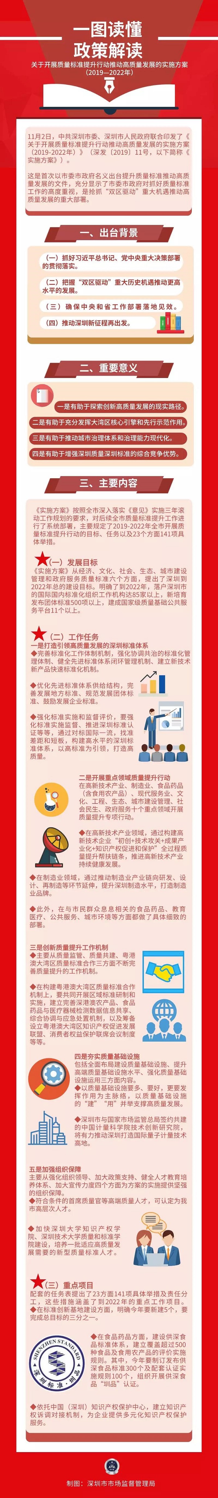 深圳是我国第一个“质量强市示范城市”和“标准国际化创新型城市”,此次《实施方案》提出了深圳到2022年在经济、文化、社会、生态、城市建设管理和政府服务质量标准六个方面的发展目标,主要规定了2019年至2022年开展质量标准提升行动的目标任务以及23个方面141项具体举措。