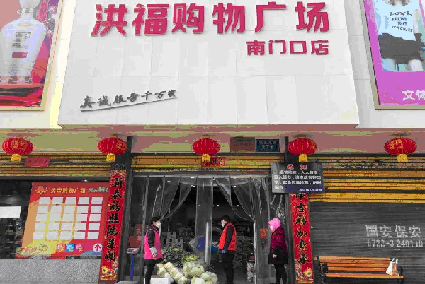 “您好,麻烦先量个体温再进超市。”在随县洪福购物广场门口,张创和何玉龙两名同志身穿志愿者马甲,熟练的戴好口罩和手套,拿着体温枪为每一个来超市购物的人测着体温。