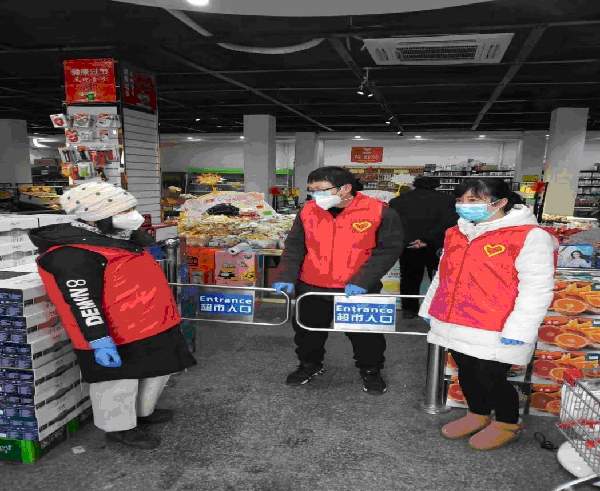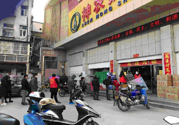 在随县神农超市门口,齐健廷、虞瑶、程秋景、谢俊和雷春梅几名志愿者正在忙碌着。作为随县厉山镇人流量最大的超市,志愿者们不仅要帮忙超市工作人员卸货、装袋,还要控制好超市里的人流量,更要维持好超市门口的购物秩序,防止人员扎推聚集而传染病毒。