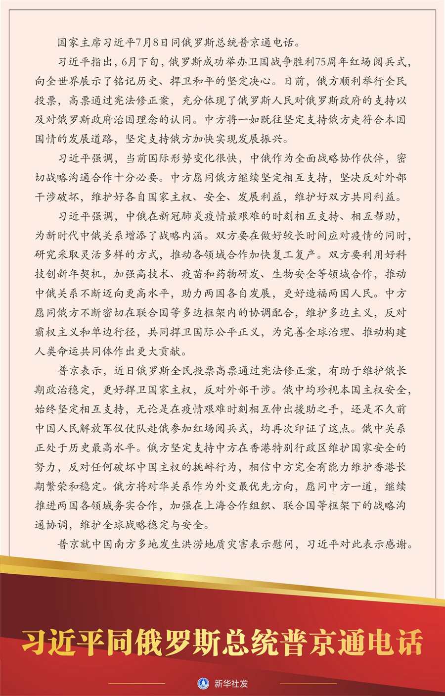 普京表示,近日俄罗斯全民投票高票通过宪法修正案,有助于维护俄长期政治稳定,更好捍卫国家主权,反对外部干涉。俄中均珍视本国主权安全,始终坚定相互支持,无论是在疫情艰难时刻相互伸出援助之手,还是不久前中国人民解放军仪仗队赴俄参加红场阅兵式,均再次印证了这点。俄中关系正处于历史最高水平。俄方坚定支持中方在香港特别行政区维护国家安全的努力,反对任何破坏中国主权的挑衅行为,相信中方完全有能力维护香港长期繁荣和稳定。俄方将对华关系作为外交最优先方向,愿同中方一道,继续推进两国各领域务实合作,加强在上海合作组织、联合国等框架下的战略沟通协调,维护全球战略稳定与安全。