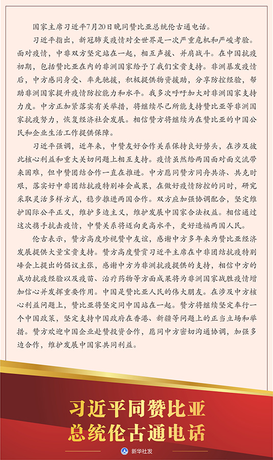 习近平强调,近年来,中赞友好合作关系保持良好势头,在涉及彼此核心利益和重大关切问题上相互支持。疫情虽然给两国面对面交流带来困难,但中赞团结合作一直在推进。中方愿同赞方同舟共济、共克时艰,落实好中非团结抗疫特别峰会成果,在做好疫情防控的同时,研究采取灵活多样方式,稳步推进两国合作。双方应加强协调配合,坚定维护国际公平正义,维护多边主义,维护发展中国家合法权益。相信通过这次携手抗击疫情,中赞关系将迈向更高水平,更好造福两国人民。