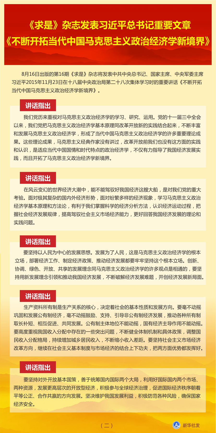 新华社北京8月15日电 8月16日出版的第16期《求是》杂志将发表中共中央总书记、国家主席、中央军委主席习近平2015年11月23日在十八届中央政治局第二十八次集体学习时的重要讲话《不断开拓当代中国马克思主义政治经济学新境界》。