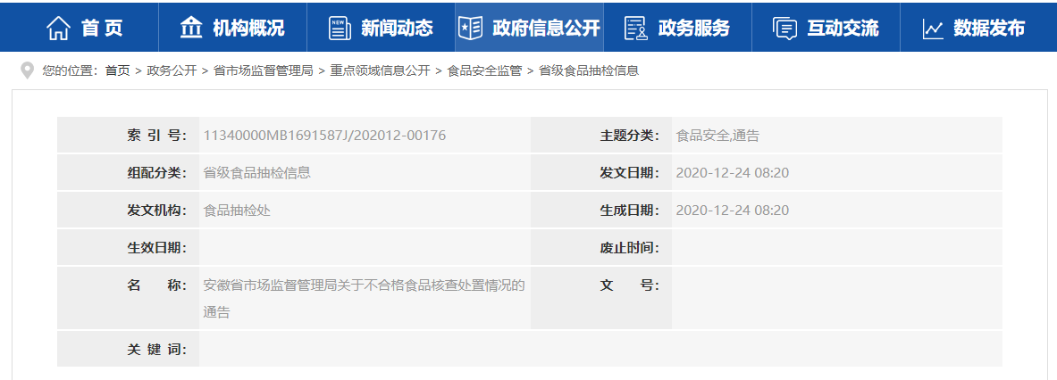 安徽省市场监督管理局关于不合格食品核查处置情况的通告