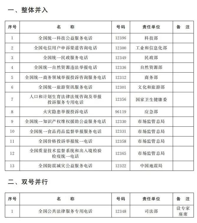 2.双号并行。话务量大、社会知晓度高的政务服务便民热线,保留号码,将话务座席并入12345热线统一管理。对于不具备归并条件的热线,可以保留话务座席,与12345热线建立电话转接机制,按照12345热线标准统一提供服务,具体由各地区根据实际情况决定。热线号码在一些地区已经取消的,原则上不再恢复。