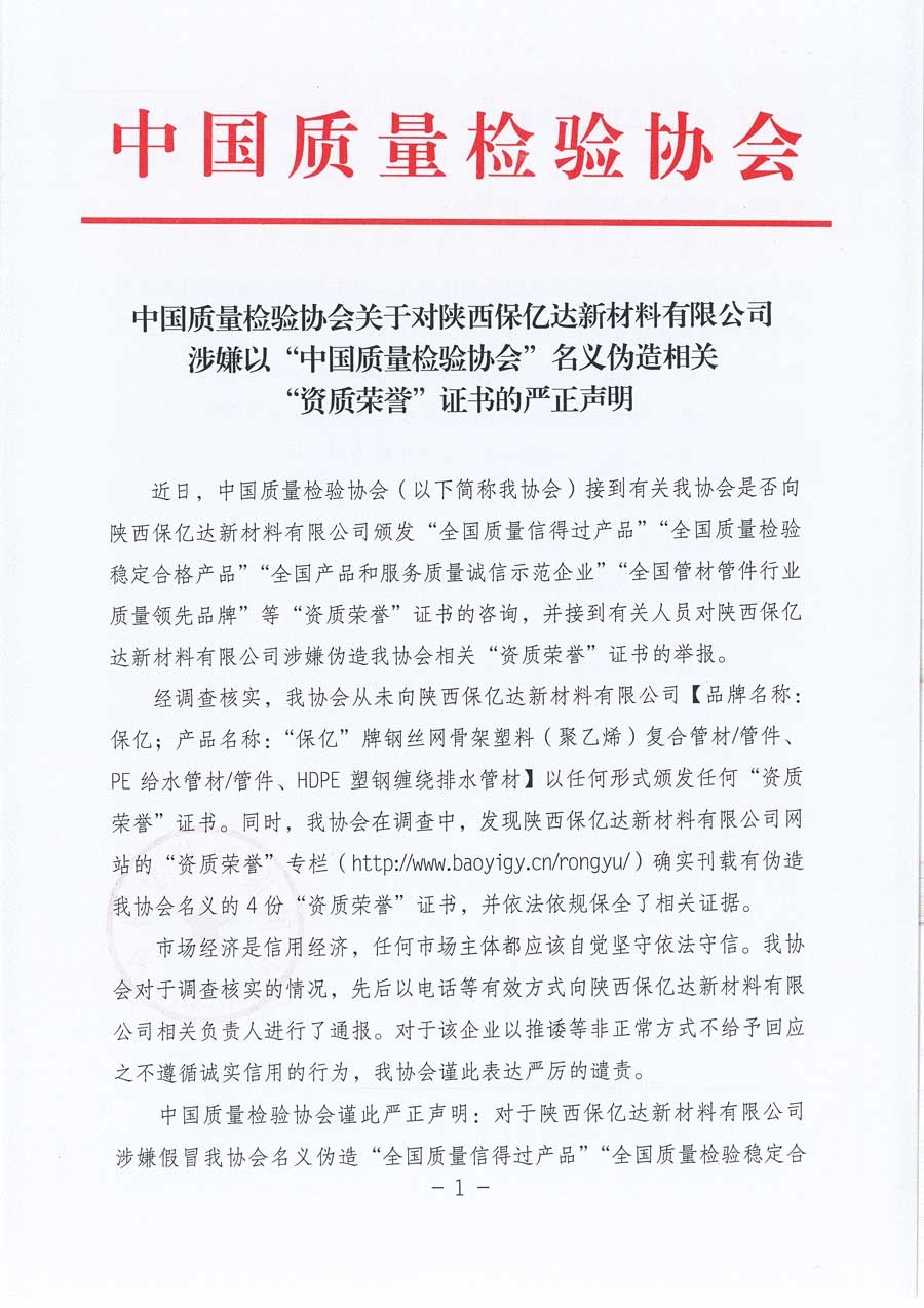 中国质量检验协会谨此严正声明:对于陕西保亿达新材料有限公司涉嫌假冒我协会名义伪造“全国质量信得过产品”“全国质量检验稳定合格产品”“全国产品和服务质量诚信示范企业”“全国管材管件行业质量领先品牌”等相关“资质荣誉”证书及相应的涉嫌违法违规行为,我协会保留追究当事人法律责任的一切权利。