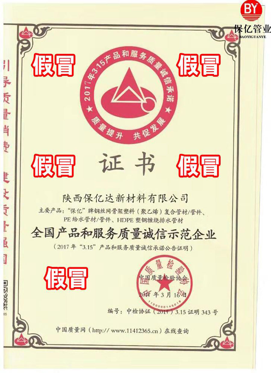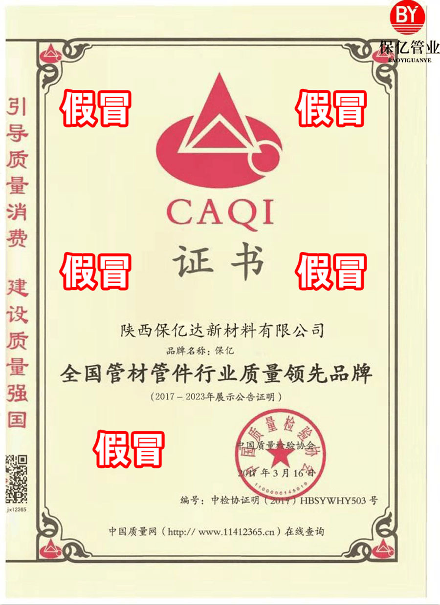近日,中国质量检验协会(以下简称我协会)接到有关我协会是否向陕西保亿达新材料有限公司颁发“全国质量信得过产品”“全国质量检验稳定合格产品”“全国产品和服务质量诚信示范企业”“全国管材管件行业质量领先品牌”等“资质荣誉”证书的咨询,并接到有关人员对陕西保亿达新材料有限公司涉嫌伪造我协会相关“资质荣誉”证书的举报。