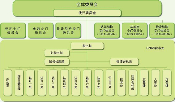 中国合格评定国家认可委员会组织机构包括:全体委员会、执行委员会、认证机构专门委员会、实验室专门委员会、检验机构专门委员会、评定专门委员会、申诉专门委员会、最终用户专门委员会和秘书处。中国合格评定国家认可委员会委员由政府部门、合格评定机构、合格评定服务对象、合格评定使用方和专业机构与技术专家等5个方面组成,总计65名代表。
