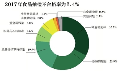从抽检发现的问题看,2017年食品抽检总体不合格率为2.4%。问题最多的是微生物污染超标,占不合格样品的32.7%。其次是食品添加剂超范围、超限量使用,占23.9%;三是质量指标不符合标准,占19.9%。其他问题还包括农药兽药禁用及残留不符合标准、重金属污染超标、有机物污染超标、生物毒素超标、检出非食用物质等。