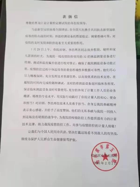 “在全国人民携手共同抗击新型冠状病毒的关键时刻,体温监测设备的性能稳定,测量准确可靠,对疫情的及时发现和防控都起着至关重要的作用。”哈尔滨市第五医院写给黑龙江省计量检定测试院的一封感谢信,指出了计量工作的重要性。