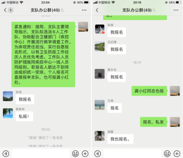 消息一出,群里立刻炸开了锅。大家没有丝毫犹豫,踊跃报名,纷纷表示要为抗击疫情决胜决战贡献自己的一份力量。