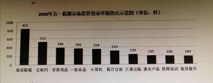 假日期间,上海市场监管局12315系统共接收各类投诉举报5527件,解答咨询1597件。其中,服装鞋帽(831件)、互联网服务(523件)、家居用品(388件)、一般食品(366件)、计算机产品(354件)等投诉举报量居前。