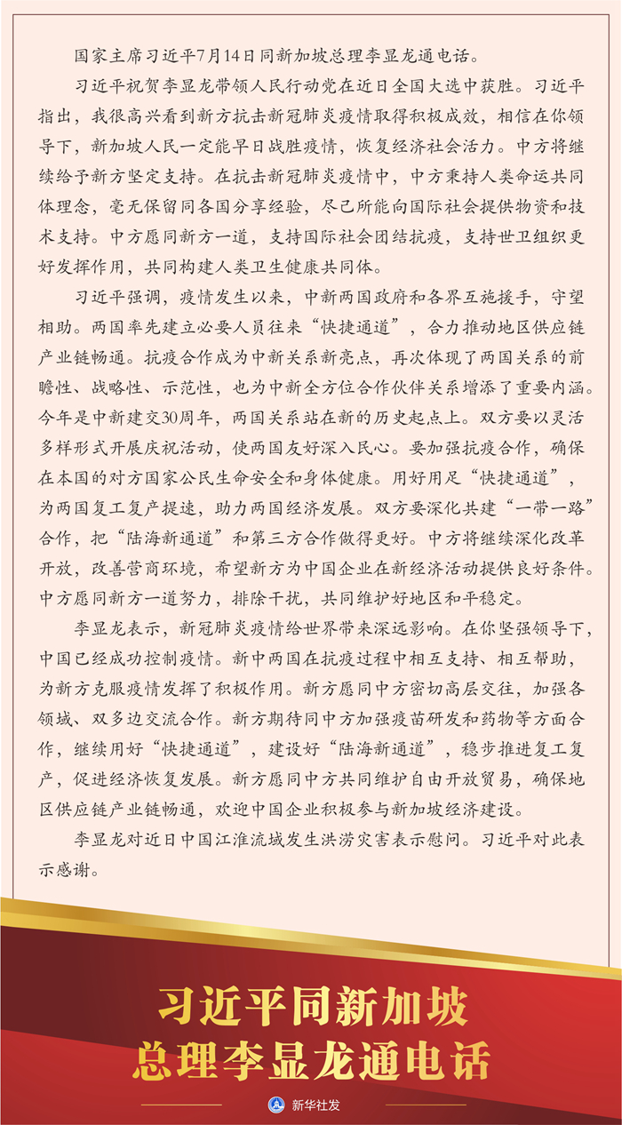 新华社北京7月14日电 国家主席习近平7月14日同新加坡总理李显龙通电话。