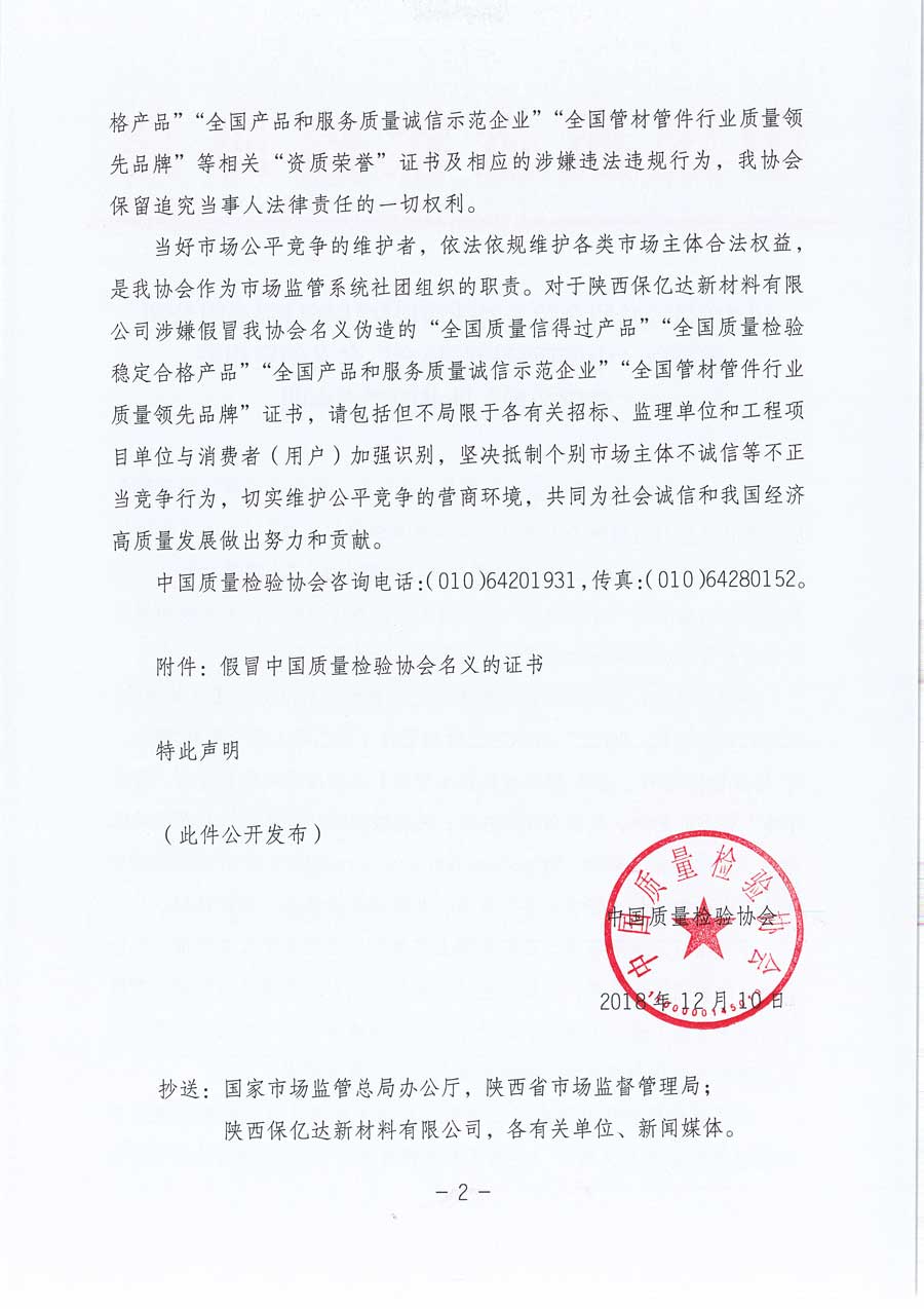 中国质量检验协会谨此严正声明:对于陕西保亿达新材料有限公司涉嫌假冒我协会名义伪造“全国质量信得过产品”“全国质量检验稳定合格产品”“全国产品和服务质量诚信示范企业”“全国管材管件行业质量领先品牌”等相关“资质荣誉”证书及相应的涉嫌违法违规行为,我协会保留追究当事人法律责任的一切权利。