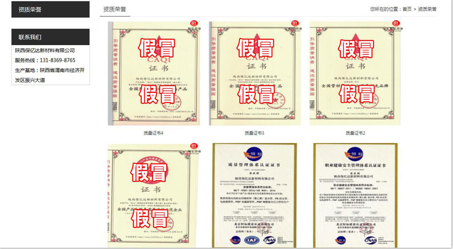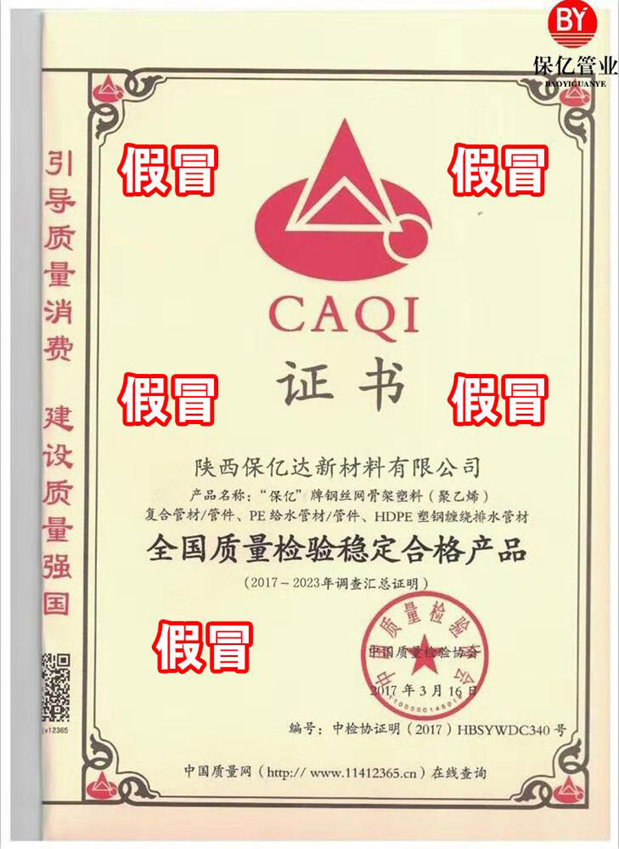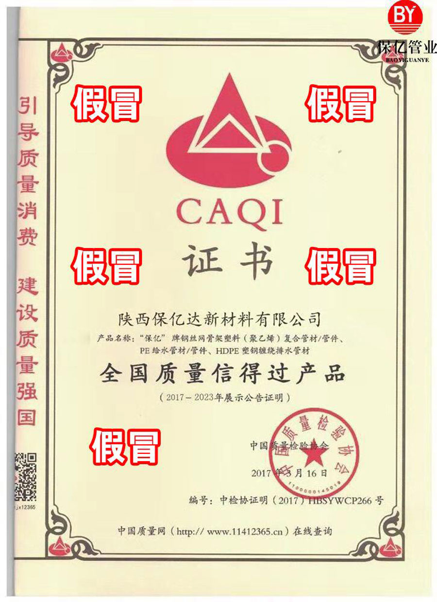 近日,中国质量检验协会(以下简称我协会)接到有关我协会是否向陕西保亿达新材料有限公司颁发“全国质量信得过产品”“全国质量检验稳定合格产品”“全国产品和服务质量诚信示范企业”“全国管材管件行业质量领先品牌”等“资质荣誉”证书的咨询,并接到有关人员对陕西保亿达新材料有限公司涉嫌伪造我协会相关“资质荣誉”证书的举报。